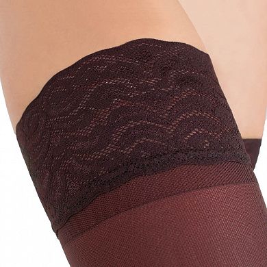 широкая резинка на чулках с красивым ажурным орнаментом обеспечивает хорошую фиксацию на бедре и подчеркивает изысканность стиля; |