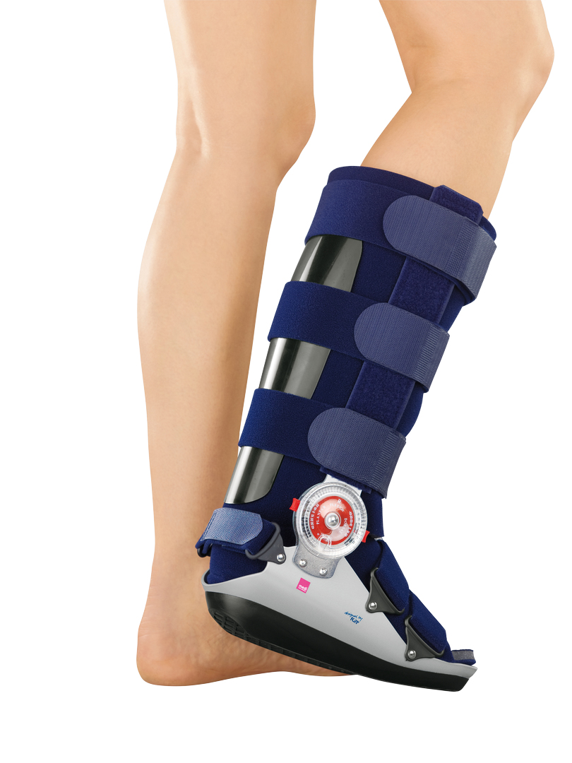 Ортез для голеностопного сустава жесткий регулируемый – medi ROM Walker – предназначен для лечения боли и иммобилизации голеностопного сустава после, рефиксации сухожилия малоберцовой мышцы, остеосинтеза таранной и пяточной кости, внутренней лодыжки, операций на связках и сухожилиях голени и стопы, при консервативном и оперативном лечении переломов малоберцовой кости, консервативном лечении травм переднего и среднего отделов стопы, а также таранной кости, лечении разрывов ахиллова сухожилия, в том числе оперативного.