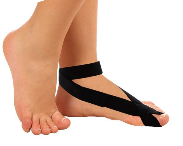 - наденьте петлю на первый палец стопы так, чтобы короткая лента располагалась по внутреннему краю стопы